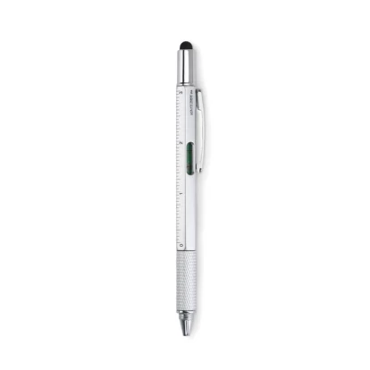 Przekręcany długopis z poziomicą. Wyposażony w linijkę, rysik oraz podwójny śrubokręt gwiazdka i płaski.